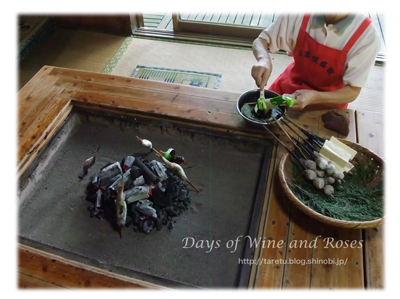囲炉裏に、串に刺した豆腐やコンニャク、里芋やヤマメを味噌をつけて焼きます。