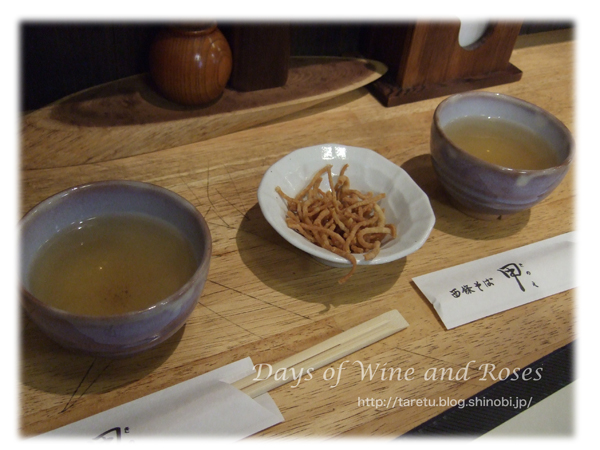 席につくと、お茶と蕎麦を揚げたものがでます。ポリポリ、ポリポリ。
