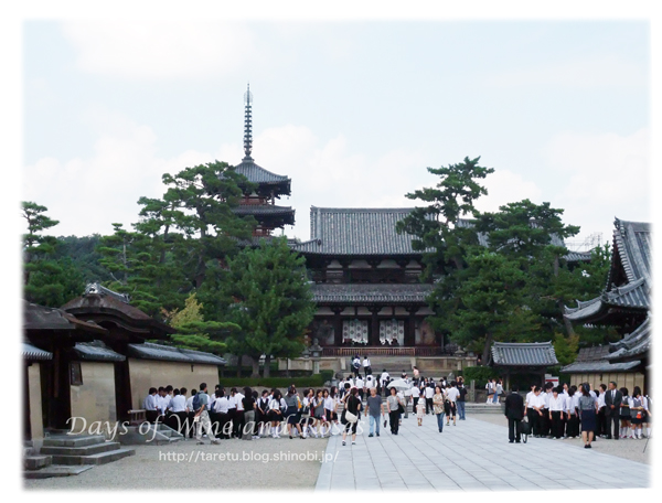 こうやってしっかりとお腹を作ってから、法隆寺へと行きました。修学旅行生でごったがえしています。