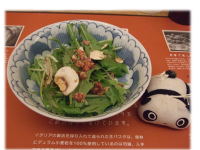 パスタを選び、280円上乗せでセットにすると、パンとサラダがついてきます。