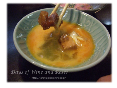 甘辛く煮込んだ鶏肉のすき焼きは卵につけていただきます。葱に、糸コンニャクに、よ~く染みこんだ出汁がうまうま~。