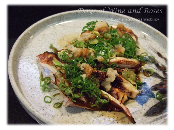 いか焼きは、焼き加減が抜群。九条葱とショウガがたっぷりとかかっていて、いいおつまみです。