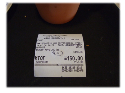 カフェイン中毒の私はそろそろコーヒーがなつかしくなってきてました。レギュラーコーヒーという表示に、ついつい値段も見ずに買ったところ。これがなんと150ルーブル。日本円にして750円といったところでしょうか。