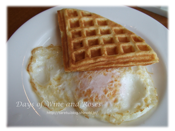 とはいえ、さすがに焼きたての目玉焼きは美味しい。とろっとでてくる黄身をパンですくって食べると最高。いっしょに目の前で焼いているワッフルも合わせ技です。
