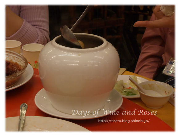 壺にはいった湯(スープ)。中国では、こういった恰好でスープがでてくることが多いです。なんでも壺ごと蒸すんだとか。