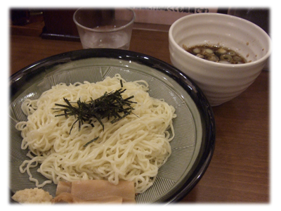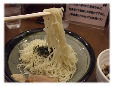 冷やしラーメン、というかつけ麺です。和風ラーメンのお店なので、脂っこくはなく、冷やした細麺をカツオ系の出汁のつけ汁で食べます。