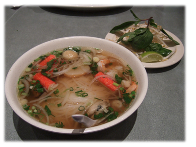 配偶者はフォー(10ドル)を食べたとのこと。海老や、フェイククラブが入ってます。別皿に盛られたもやしや香菜を入れて食べます。ライムも絞り込むと美味しいです。
