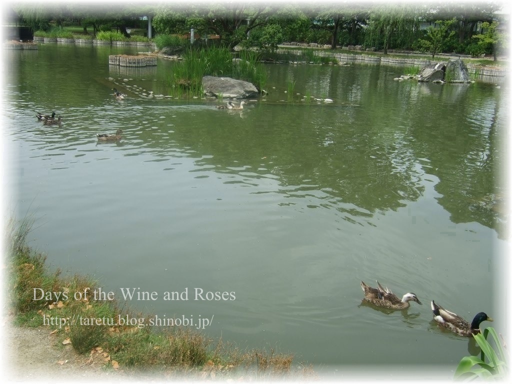 鴨を追って歩をすすめると、そこは菖蒲池。暑い日ですが、鴨は水面を楽しそうに浮かんでいます。