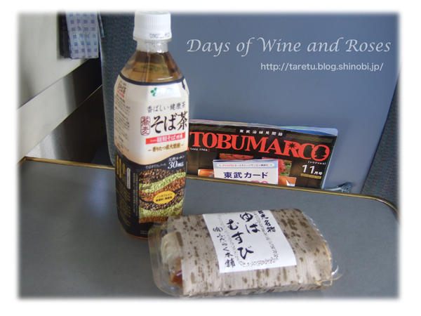 これは帰りの列車の中で食べた、日光名物「ゆばむすび」です。ペットボトルに入ったそば茶といっしょにいただきました。お弁当屋さんではなく和菓子屋さんで売っていたものです。