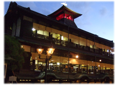 道後温泉のシンボルともいえる道後温泉本館もきれいにライトアップされて、赤い硝子と、天井の白い鷺が美しいです。