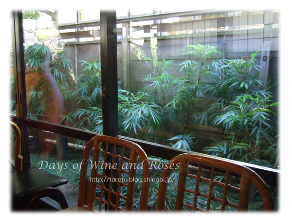 らたんの椅子。大きな窓からは外の庭が見えています。