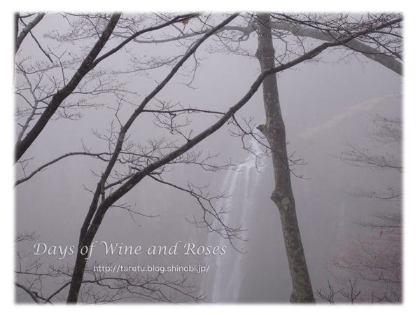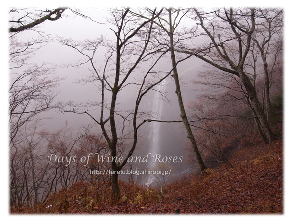 霧に包まれて、白い瀑布がおちかかる自然の光景の美しさ。