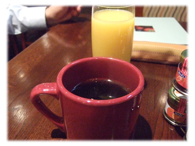 朝食を注文すると、コーヒーとオレンジジュースがサーブされます。