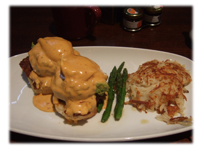 配偶者は、おすすめされたサザンブレックファーストを頼みました。南部風のビスケット(フライドチキンででてくるアレです。)とってもからいソーセージと、アボガドがはさんであって、上からチーズソースがたっぷりとかかっています。