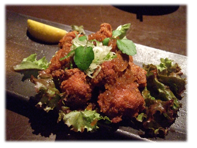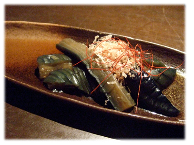 さて、お料理がでてきます。最初はあっさりと前菜(?)三品。まずは秋茄子揚げ浸し。季節モノということも手伝ってなかなかのお味。個人的にはこれが一番美味しかった。