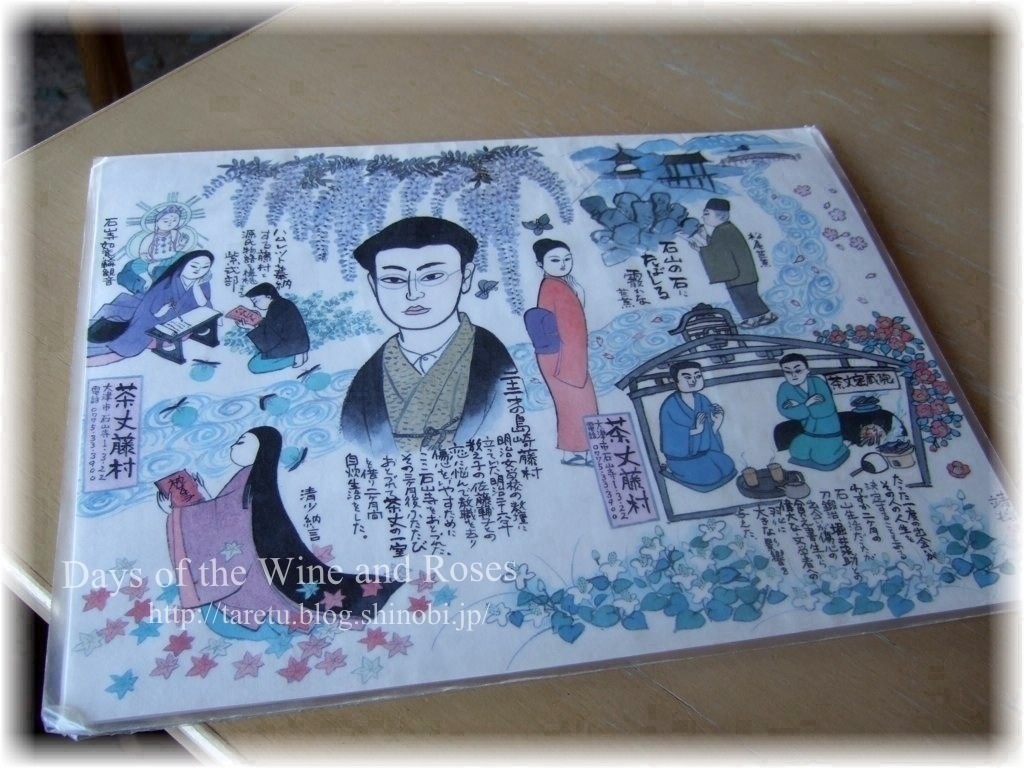 茶丈 藤村 の名前の由来、作家の島崎藤村が石山寺の庵を借りて住んでいたことや、石山寺に関するいろいろなTipsが描かれた漫画絵。
