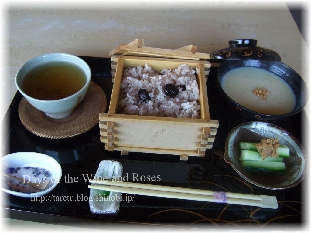 大きな丹波黒豆のおこわと胡麻豆腐の白味噌のお味噌汁、きゅうりの鯛味噌のせがついています。