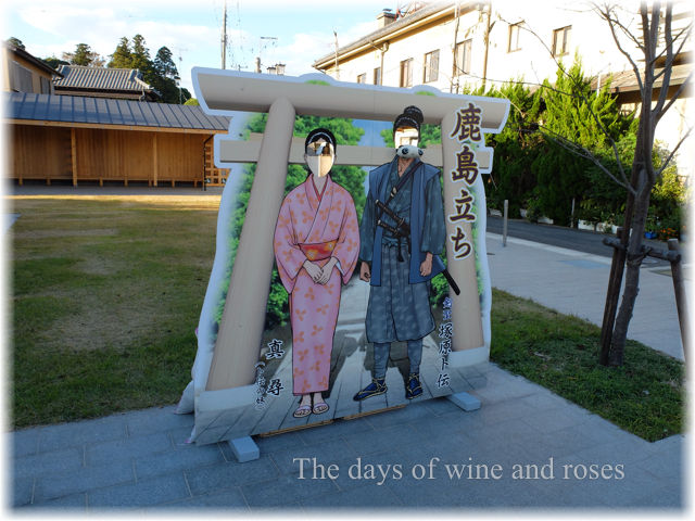 鹿島神宮からの帰り道、参道でみつけた鹿島立ちのパネル。あさたれくんに入って貰いました。