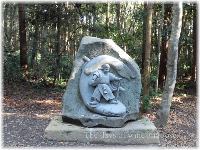森の中には、祭神鹿島神(かしまのかみ)タケミカヅチの像が。地震抑えの神として、要石に住まう日本に地震を引き起こす大鯰を押さえ込んでいます。
