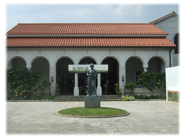 ロマネスク様式の修道院のような赤い屋根の西洋建築。ううむ、ちょっと浮いているかも。