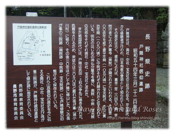 戸隠の由来が刻まれたパネルです。長い、長い歴史の中で、ある時は乱世を避け、ある時は権力に保護され、山岳信仰を伝えた修験の場を脈々と伝えてきた様子です。