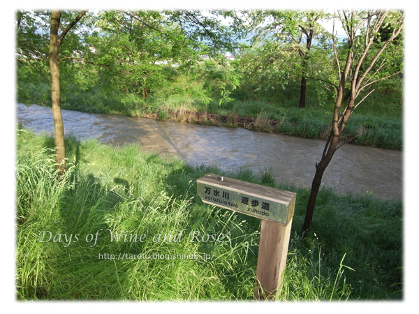 大王わさび農場までは徒歩で25分くらい。途中までは万水川の遊歩道を通っていきます。緑があふれ、花も咲き、折からの雨で残念ながら川は濁ってしまっていますが、それでも美しい。