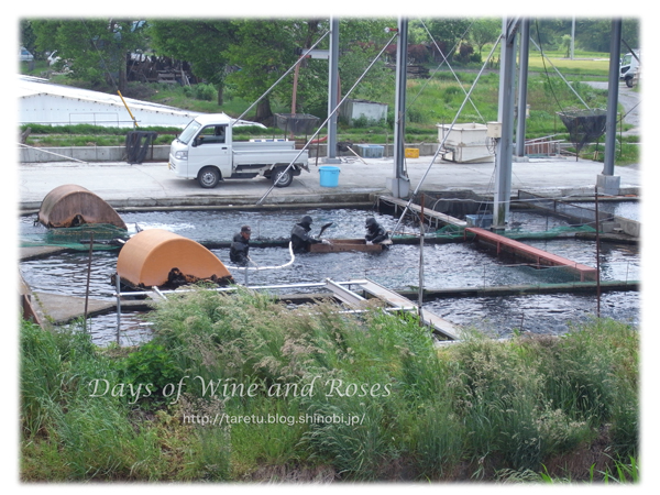 これは、どうも鱒の養殖場なんですね。よく「安曇野サーモン」「信州サーモン」という名称を食べ物屋さんでみかけて。うーん、この山の中の盆地で、サーモン?なんで??って思っていたのですが、この鱒がその正体。正確に言うと、