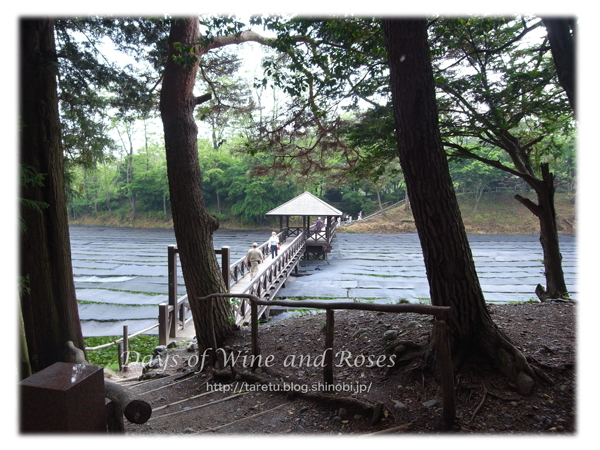 わさび田を横切る橋まであります。「幸せの架け橋」という名だそう。橋の上から見るわさび田もまた面白い。