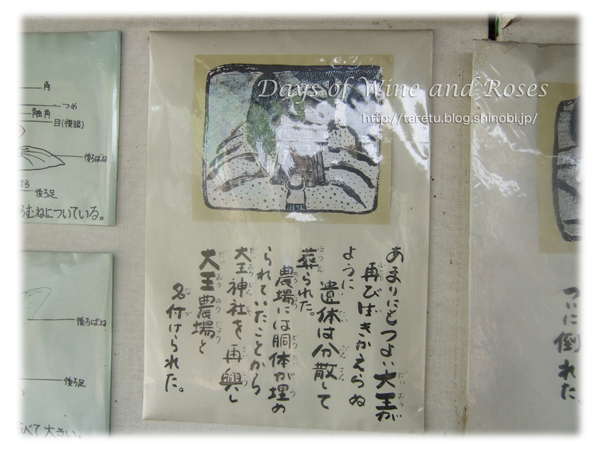 「あまりにもつよい大王が再びいきかえらぬように、遺体は分散して葬られた。農場には胴体が埋められていたことから、大王神社を再興し、大王農場と名付けられた」