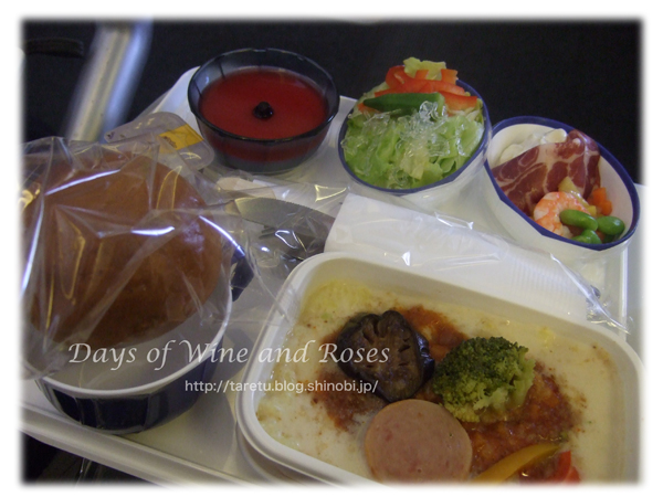 添えられているのは生ハムと海老の前菜、グリーンサラダ。全体的に量は控えめ。長い時間機内にとじ込められるので、私には丁度良いくらいかな。