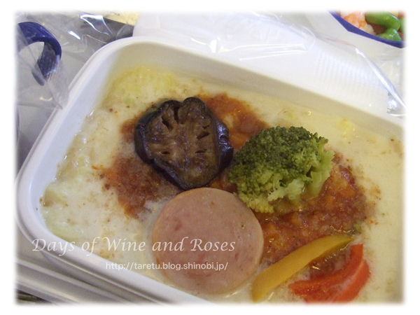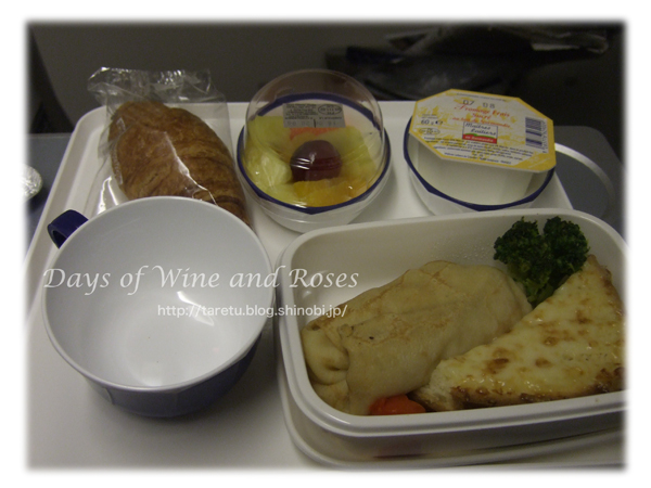 機内食は、一般に炭水化物ばっかりなのでパンは残すことにしています。