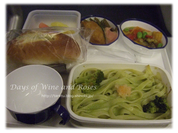 着陸二時間前の二度目の食事は、昼ご飯。バジルペーストで和えたフィットチーネでした。