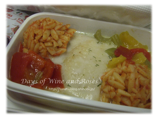 帰路は夕食です。鱈のクリームソースにトマトソースであえた米のようなカタチのパスタ。