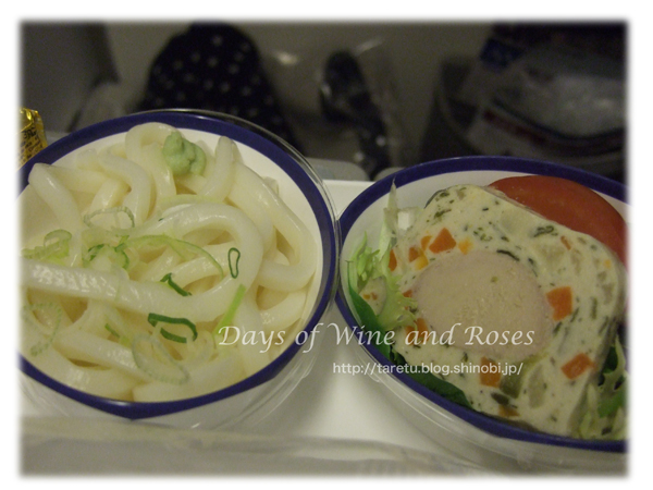 もうひとつ副菜として冷やしうどんがついてきます。もちろん、機内食の冷やし麺なので、コシはないのですが、添えられたたれは美味しくて。