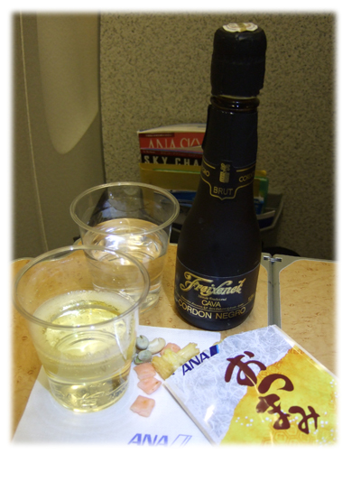 さて、機内で落ち着いたら最初に出てくるのは飲み物。ANAなので、まだアルコールが無料です。配偶者は早速スパークリングワインを飲んだ様子。