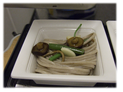 日本の航空会社は必ずといっていいほど、麺を出すようになっています。これは山菜蕎麦のようですね。