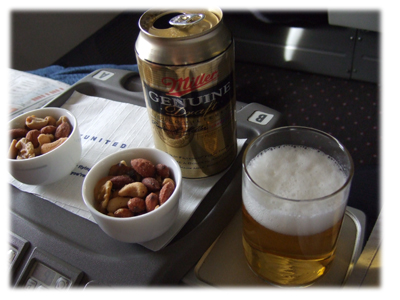 ビジネスやファーストクラスの象徴(?)、温めたピーナッツがおつまみに出たそうです。ウェルカムドリンクのシャンパンを飲んだ後なのに、さっそくビール。