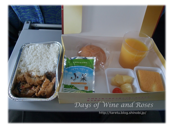 中国南方航空の機内食は…えーと。微妙だったようです。普段、食べ物を決して無駄にしない配偶者でも、ちょっと全部は食べきれなかった様子。