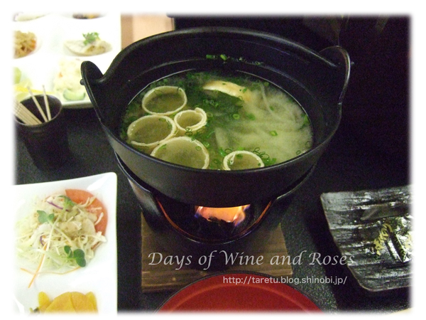 味噌汁は、アルコール燃料でテーブル上で温めるタイプ。凝ってますねえ。