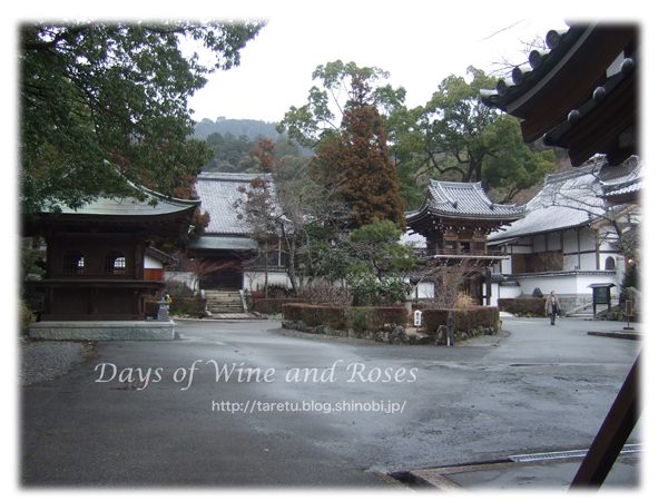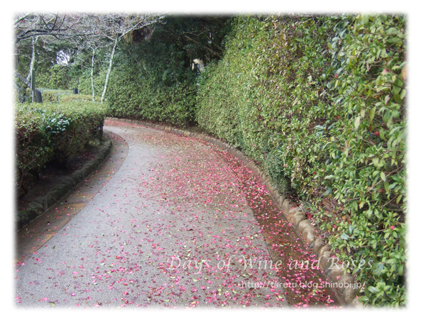 境内の小径はおりからの雨で濡れて、そこに木から落ちた椿の花が散っています。