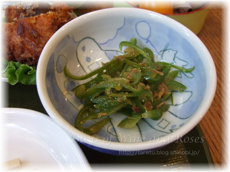 面白かったのがピーマンのお浸し。細く切ったピーマンを炒めて、煮浸しにしてありました。ピーマン臭さが抜けていて食べやすい。