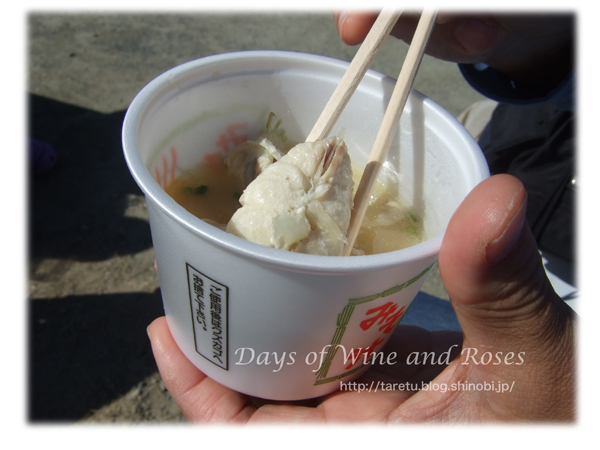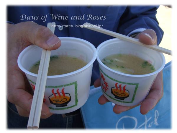かなり長い行列ができていたので、あきらめて他のところに行った後戻ってみると、限定500食がすっかり売り切れていて、お味噌汁の販売だけやってました。