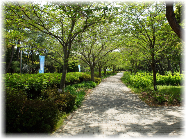 海浜公園に入ると、新緑の桜並木が迎えてくれます。