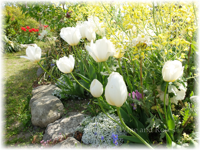 白いチューリップがいっしょに寄せ植えてありました。