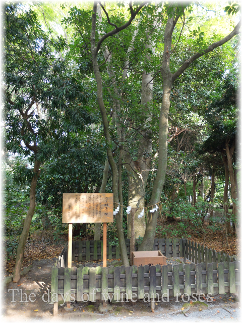 道の途中にはもうひとつのご神木、相生の樫。相生とは一つの根元から二つ幹が分かれて伸びること。また、2 本の幹が途中で一緒になっている ことをいいます。神社にはこういう相生をご神木としたところが多く、縁結びや夫婦和合の象徴となっているようです。