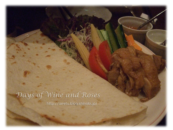 ピタパンに鶏肉のソテーをはさんで。野菜といっしょにサンドイッチのように食べます。