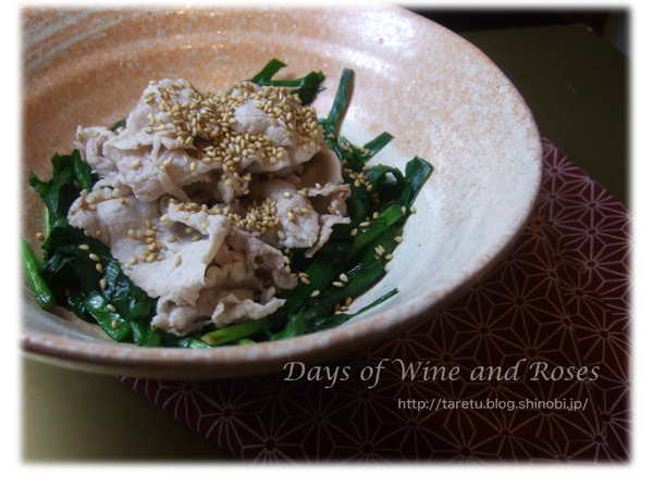3.炒めたニラの上に豚肉をのせて、ゴマを少々ふりかけます。