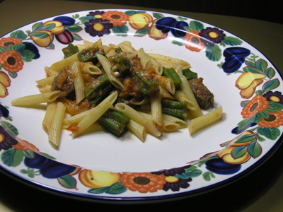 ペンネアラビアータΛスタイル。イタリア料理の定番ですが、今日はオクラを入れてみました。トマトソースとオクラといえば、ニューオリンズ料理のガンボが有名ですが、ベストマッチング。しかも、とろみが足りない自家製ソースに、良い具合にとろみがついて、パスタにからみやすくなります。