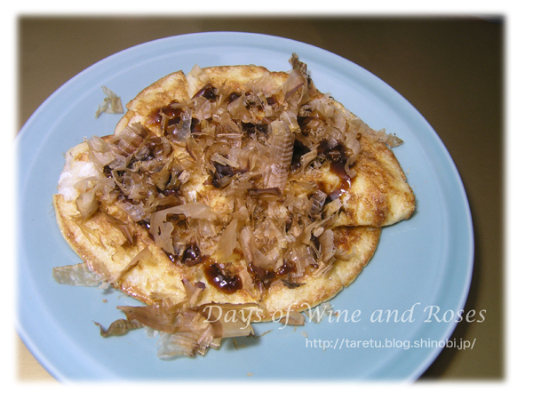 3.花カツオをトッピングして、おたふくソースで食べます。