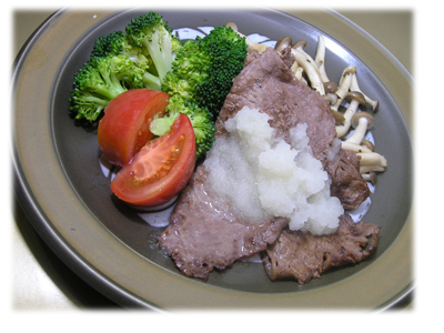 6,準備した皿に焼けた肉と、つけあわせとを盛ります。写真は大根おろしをかけていますが、別皿にたっぷりの大根おろしに柚子酢だれをいれて、肉を絡めて食べてもいいです。